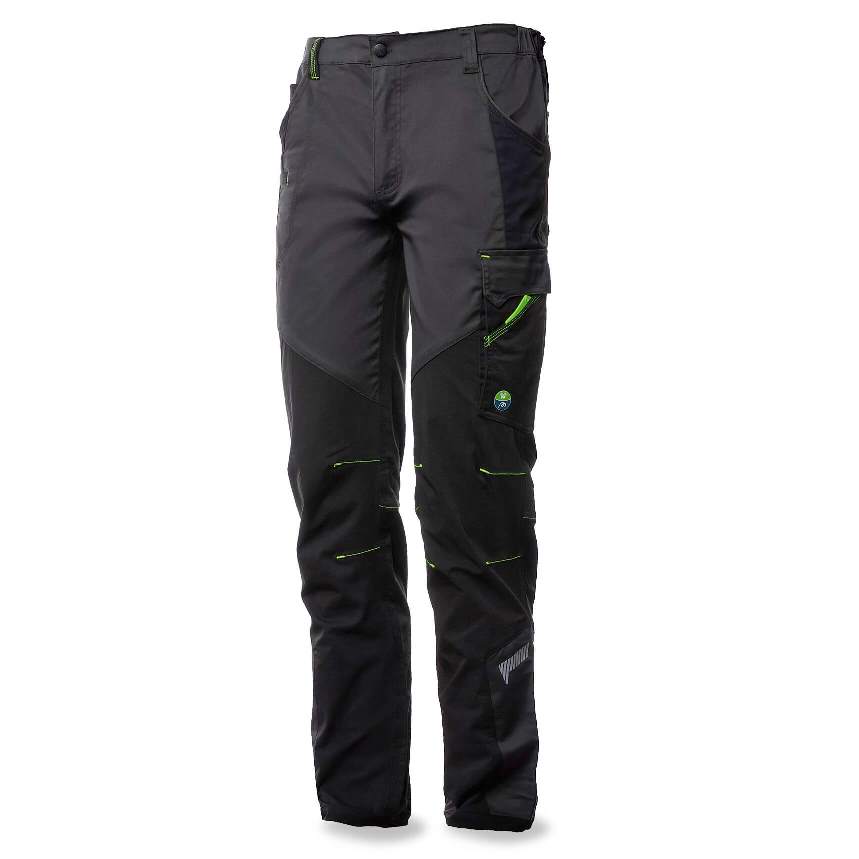 Pantalón gris/negro con detalles fluorescentes en color verde y tejido stretch con triple costura para mayor resistencia.