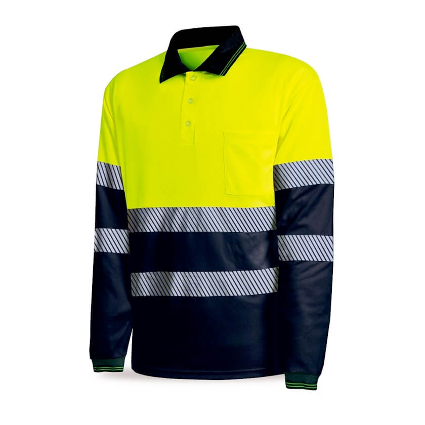 Polo bicolor de manga larga con bandas reflectantes segmentadas, Amarillo o Naranja fluorescente de alta visibilidad combinado con Azul Marino, con tejido de 150 gr/m2, y composición 100% poliéster.